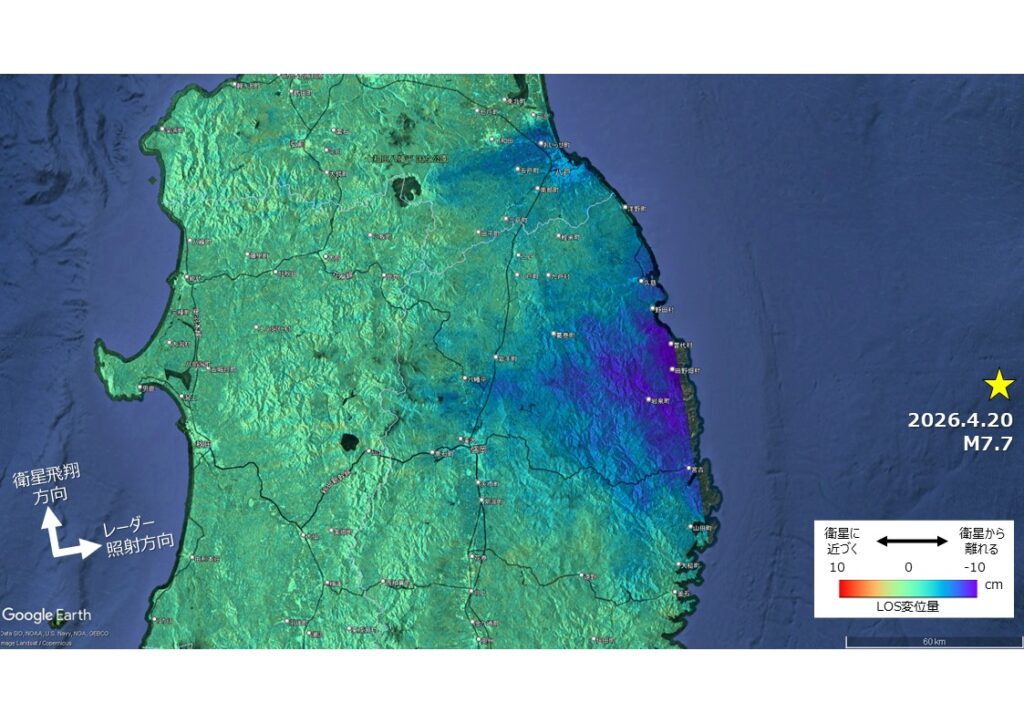 2026年4月9日および2026年4月21日の北行軌道で取得された観測データについて処理を行いました。図は衛星視線方向(LOS方向)の変位量分布です。図中の黄色の★は、気象庁より取得した震央の位置を示します。衛星から遠ざかる方向を負の変位量として表しており、北行軌道では東または沈降またはその両方の方向への変位を意味しています。岩手県の太平洋沿岸を中心に、最大約9 cmの衛星から遠ざかる変位が認められます。これは、国土地理院の電子基準点で観測された変動と調和的です(https://www.gsi.go.jp/chibankansi/chikakukansi_20260420_sanrikuoki.html)。なお、本処理結果は速報扱いであり、水蒸気遅延等は未補正の状態です。